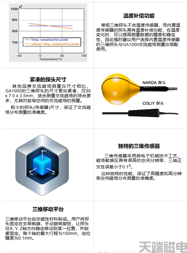 TGA1000交流磁场检测仪的三维探头采用了微电子机械制造工艺,具有很高的空间分辨率,三轴正交误差<0.1°,保证了高精度和高分辨率空间磁场分布测量的准确度;三位交流探头厚度仅3.5mm,也可适用于狭窄空间的交流磁场检测。